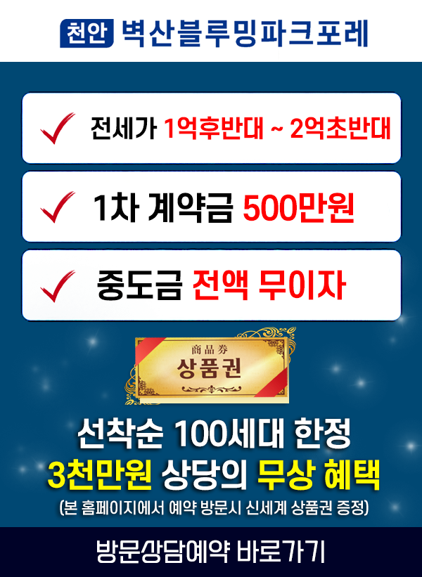 천안 벽산블루밍파크포레 방문예약 고객의 개인정보를 수집합니다.수집한 개인정보는 방문예약 이외의 목적으로는 사용하지 않으며, 모집 기간 완료 후 즉시 파기합니다. 개인정보의 수집 및 이용에 대한 동의를 거부할 수 있으며, 이 경우 방문예약 접수가 어려울 수 있습니다.